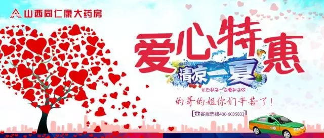山西同仁康大藥房太原市與孝義市各藥房在7月7日--9日為“的哥、的姐”送上我們***真摯的祝愿,我們?yōu)槟呐谥屏讼顩霾韫┠赓M(fèi)飲用。并且現(xiàn)場(chǎng)掃碼即可獲贈(zèng)價(jià)值26.3元的消暑防治藥品(天士力集團(tuán)的藿香正氣滴丸和哈藥集團(tuán)的諾氟沙星膠囊),同時(shí)現(xiàn)場(chǎng)還免費(fèi)贈(zèng)送您價(jià)值5元的優(yōu)惠券四張,持此券您可在山西同仁康各藥房特惠購(gòu)藥。